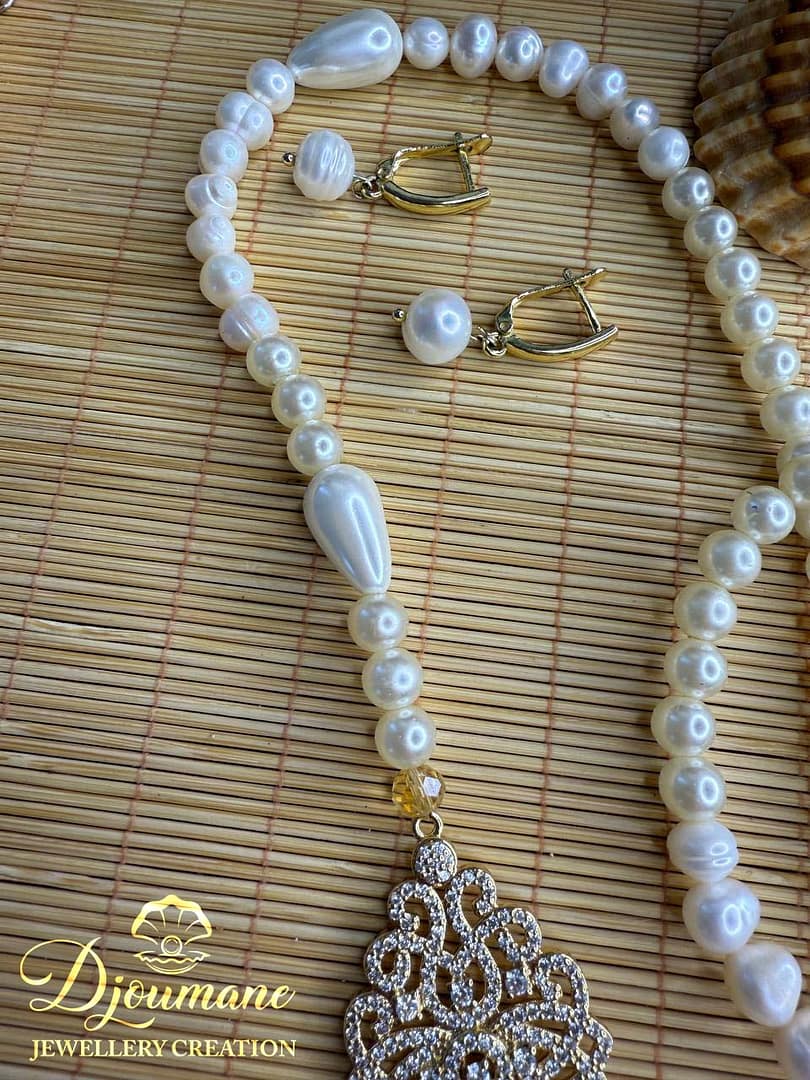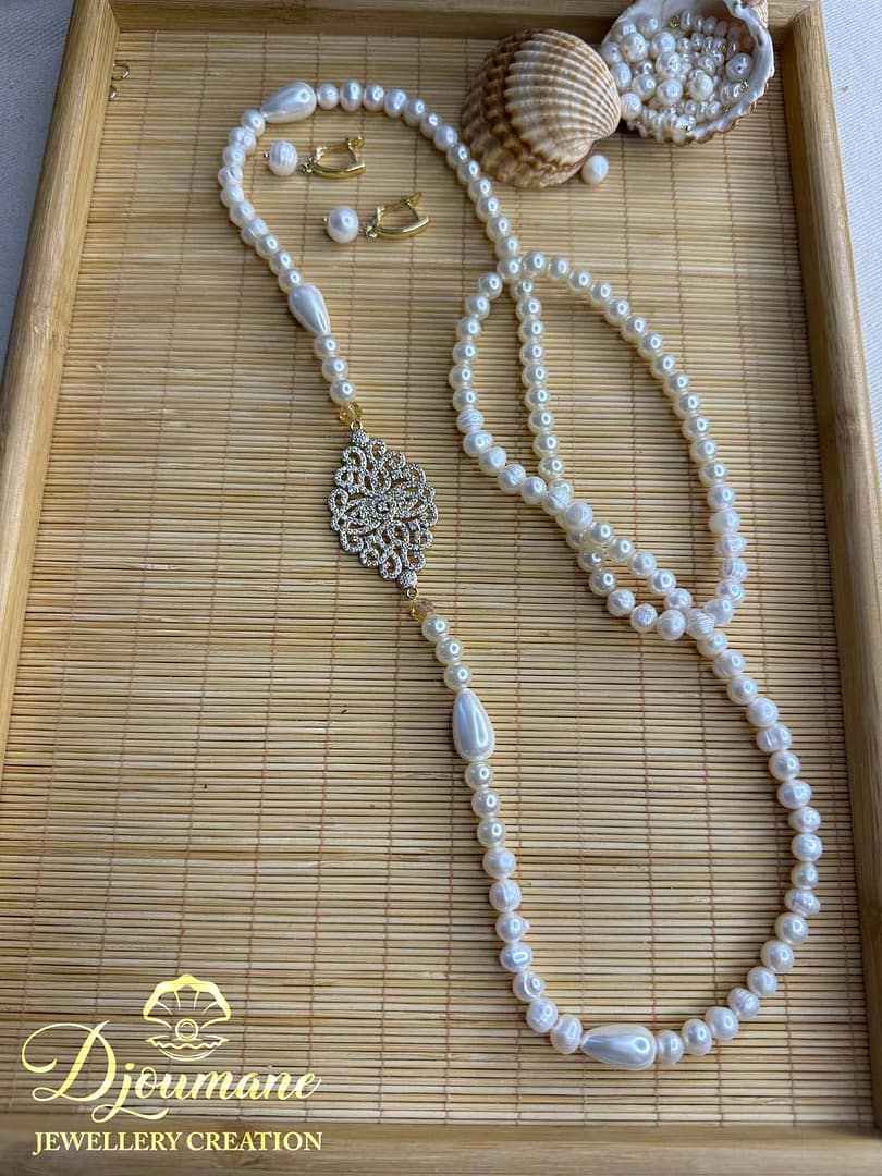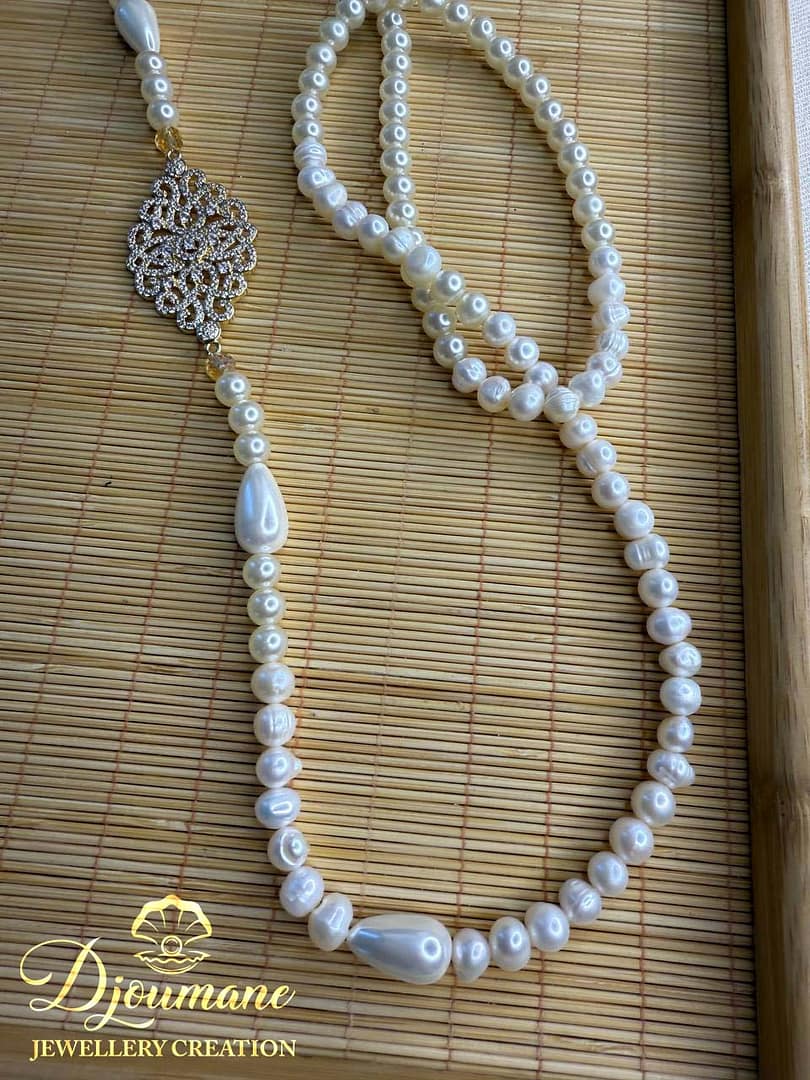 Sautoir 90 Cm en pierres d’eau douce (جوهر حر) et Majorque . motifs en acier inoxydable et pierres de zirconium